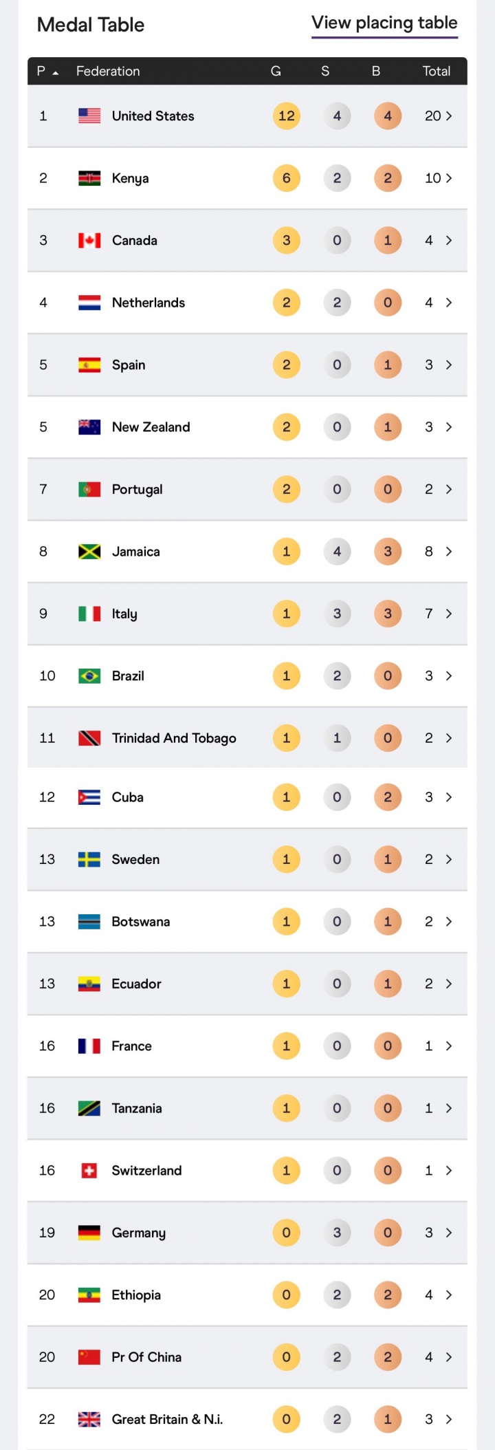 獎牌榜的前十名中,不乏傳統田徑強國煥發新生。加拿大以3金1銅的成績名列第三,荷蘭、西班牙和新西蘭並肩戰鬥,均展現出了強大的競爭力。另有葡萄牙和牙買加等國同樣在賽場上綻放光彩,力爭在接下來的比賽中更上一層樓。