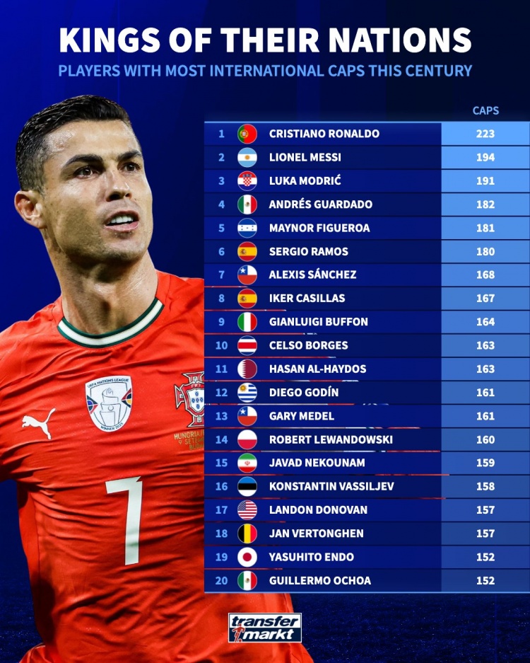 C罗以223场国际比赛出场次数位列本世纪球员之首
